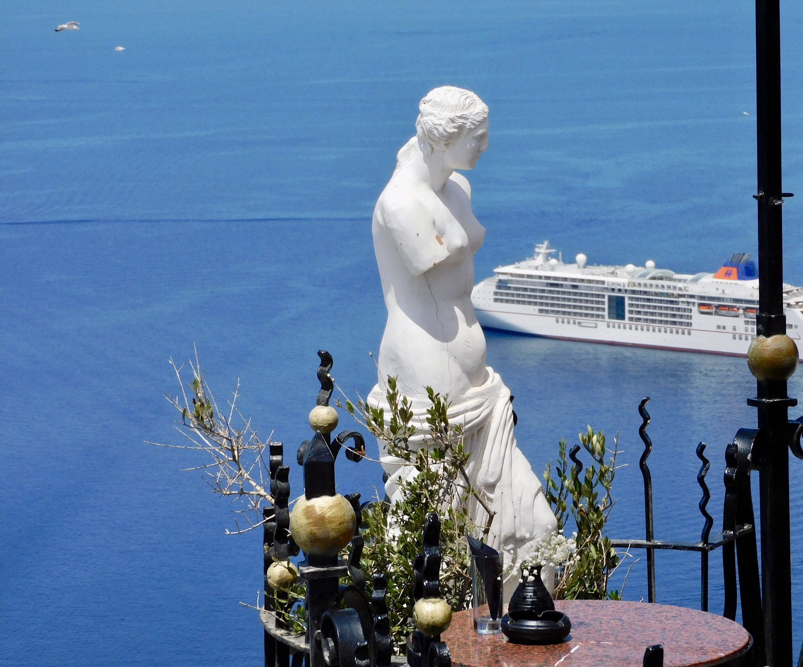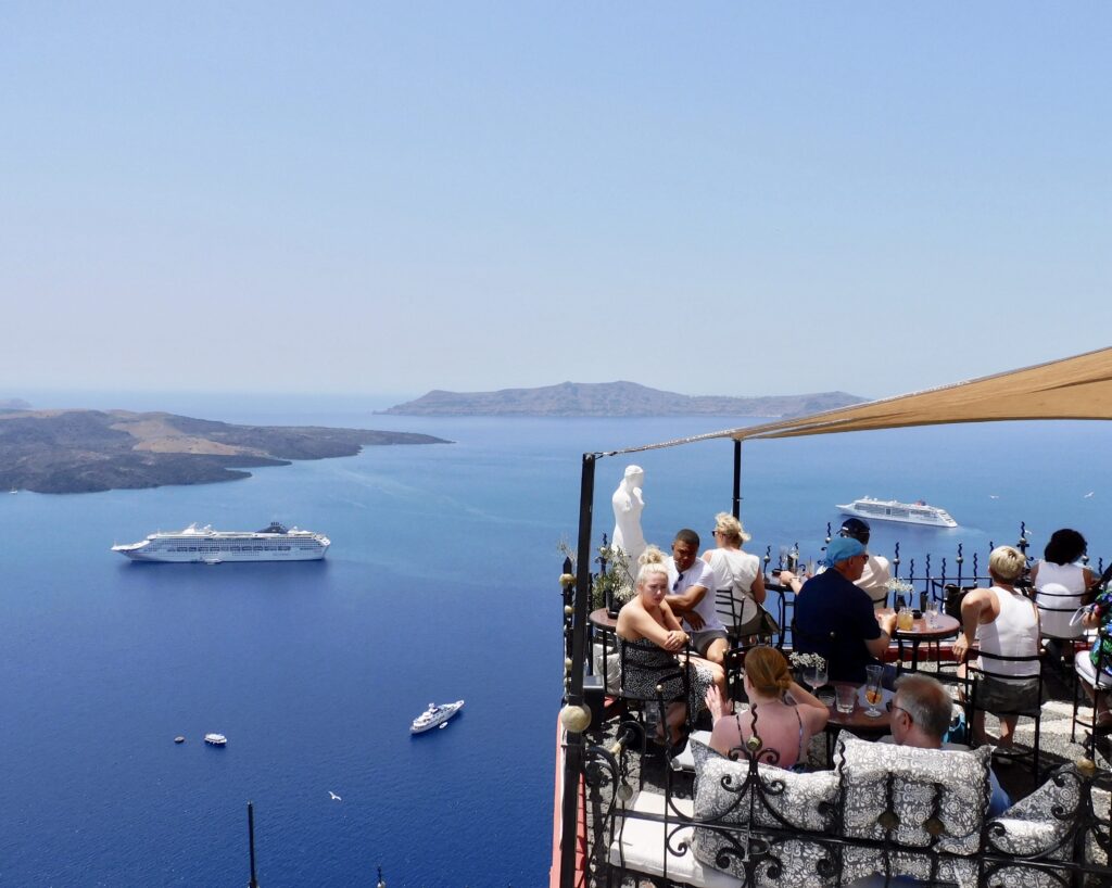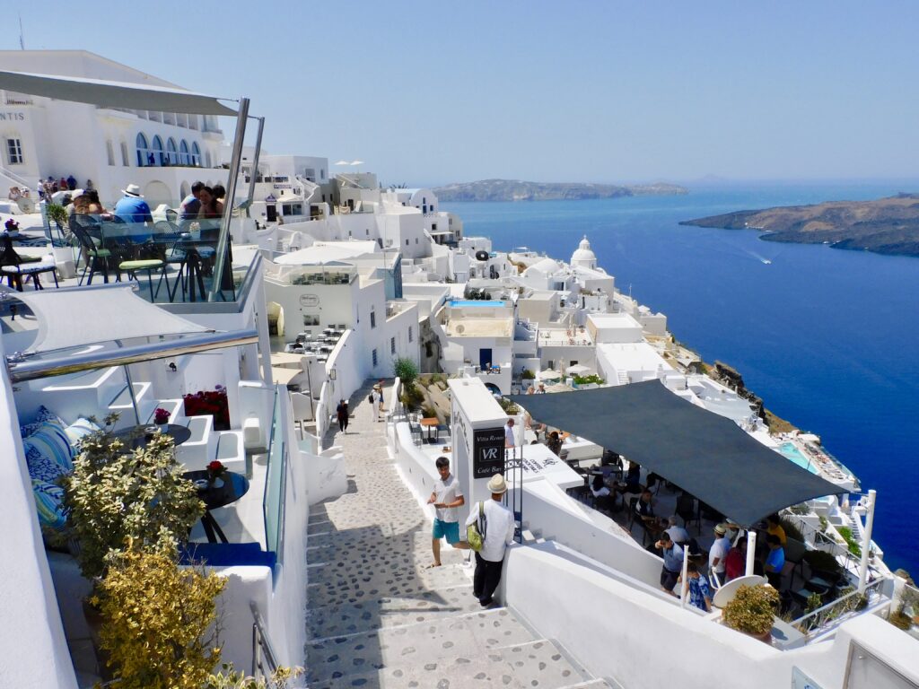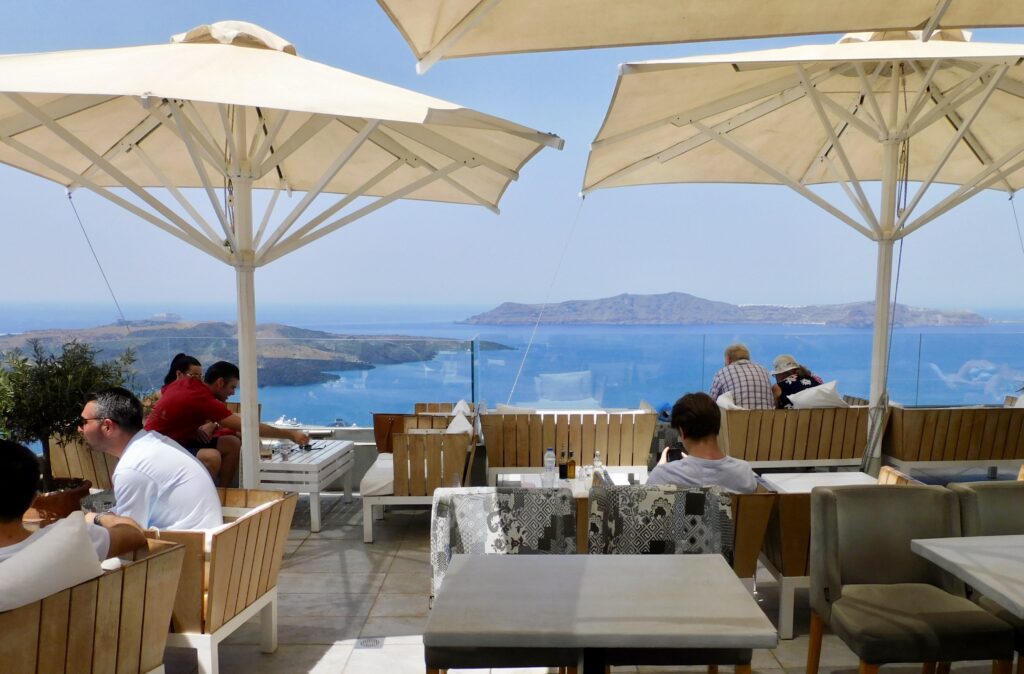 De hvitkalkede husene i kykladisk stil som ligger på den stupbratte klippen over calderaen står i sterk kontrast til det azurblå havet. Legger du ferien hit, nytes den best ved bassenget med iskald drikke i hånden og blikket hvilende på den magiske utsikten. Kommer du hit som dagsturist har byen et rikt utvalg av restauranter og barer der du kan nyte god mat og forfriskninger fra en takterrasse. I sentrum av Fira finner du blant annet restauranten V Lounge cafè og cocktailbar. Her kan du nyte et gresk måltid i myke lounger med behagelig chillout musikk i bakgrunnen mens du skuer utover havet og det yrende båtlivet med cruiseskip, yatcher, og seilbåter.